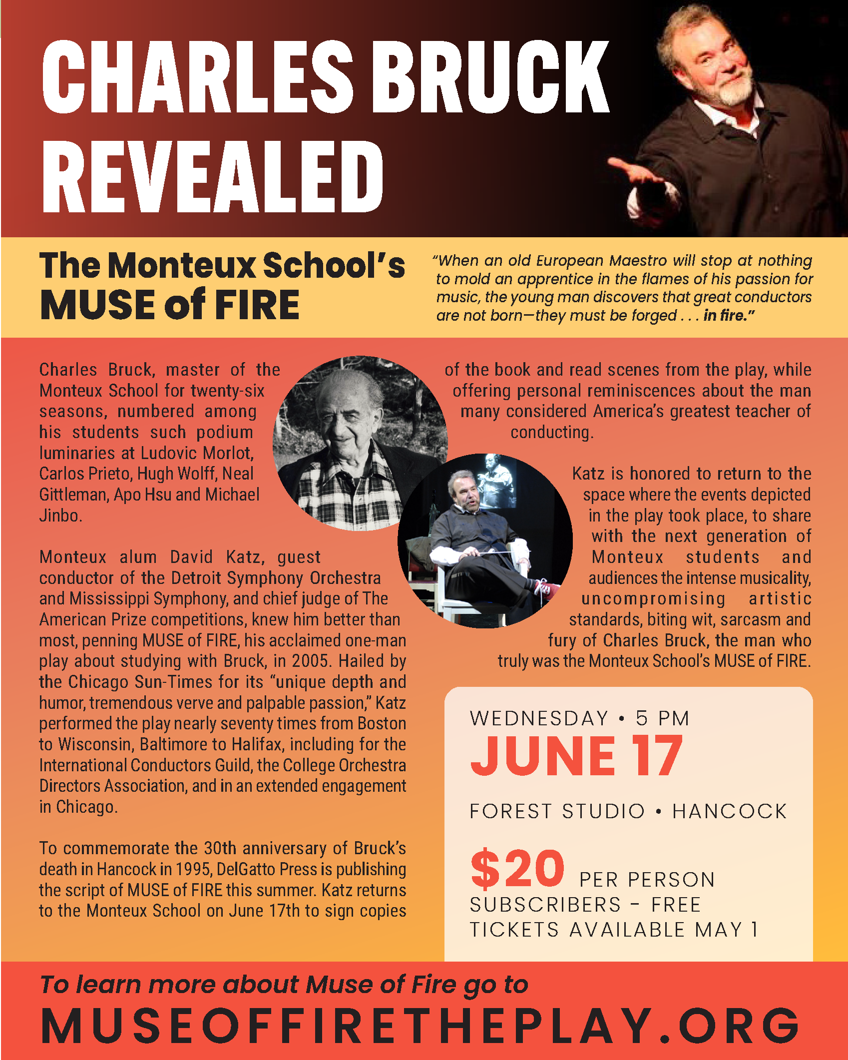 We are also present a one of a kind event this summer. Monteux Alumni David Katz returns to Hancock to delight us in Charles Bruck Revealed: The Monteux School's Muse of Fire. David Katz created his one-man play, The Muse of Fire, drawing inspiration from his studies with Maestro Charles Bruck, the second teacher at the Monteux School. Mr. Katz will also share personal anecdotes about the man who inspired this acclaimed play. This promises to be an evening filled with entertainment and memorable stories! For more details, please refer to the attached flyer.